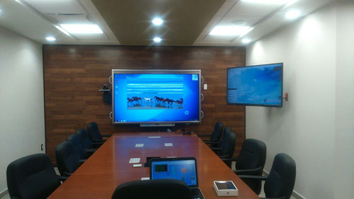 Las Salas de Juntas Modernas pueden integrar Sistemas de Colaboración inalámbrica, Pantallas Samsung Flip, Sistema de Apartado de Salas, pantallas touch, pantallas, microfonía, pizarrones interactivos, Videoconferencia, Telepresencia, iluminación, sistemas de audio, así como touch panels para controlar los elementos instalados.